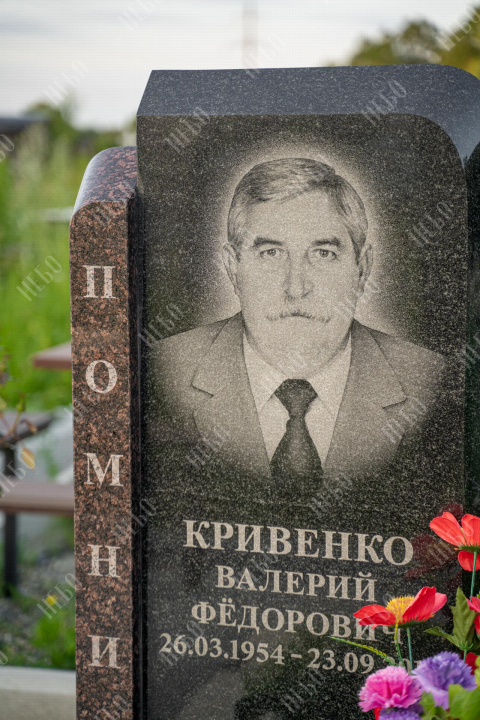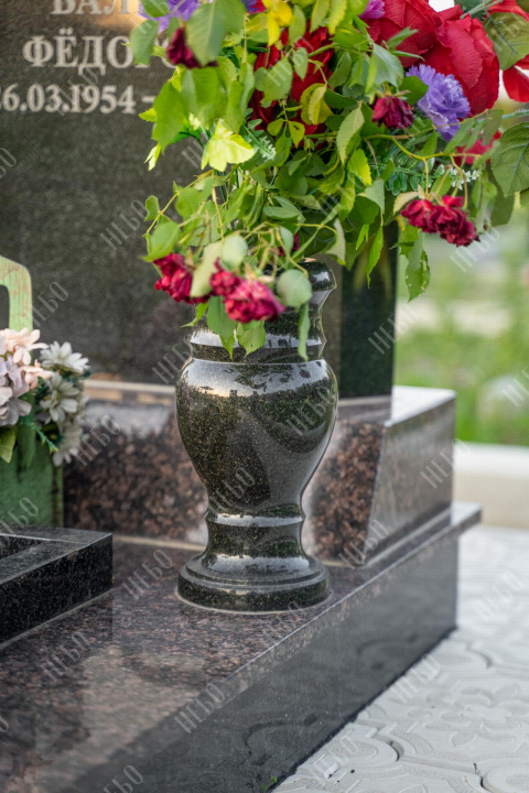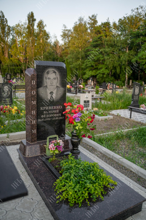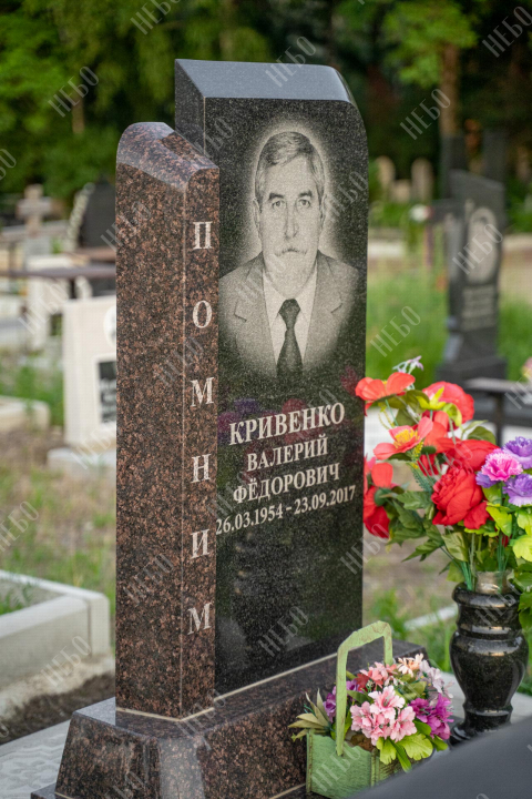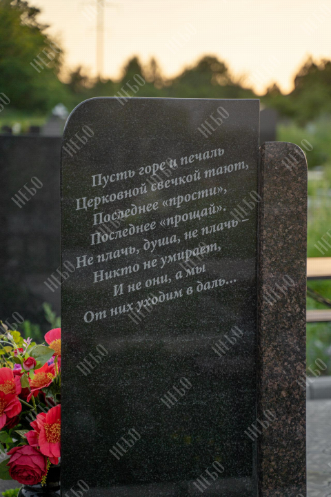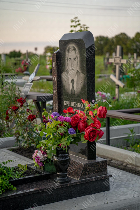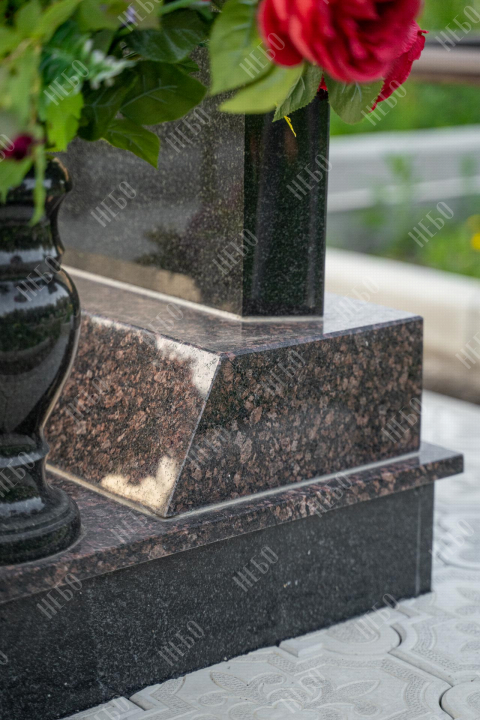 Памятник без креста с вертикальной стелой и открытым надгробием выполнен в классических темных оттенках. Стела имеет дополнительный декоративный элемент в виде вертикального столба контрастного оттенка с гравировкой. Контур памятника имеет скошенные углы, что придает ритуальному изделию индивидуальность. Открытое надгробие позволяет использовать его поверхность для высадки цветов или других растений. При изготовлении памятника специалисты тщательно прорабатывают соотношение форм, размеров и нагрузку, чтобы исключить деформации и искажения изделия со временем.