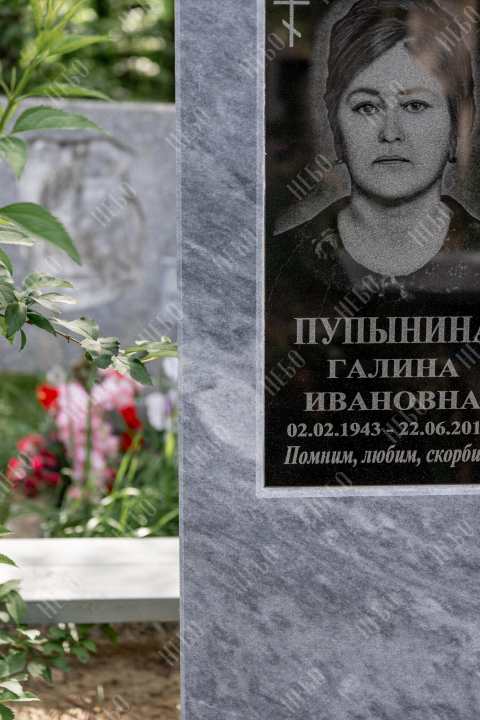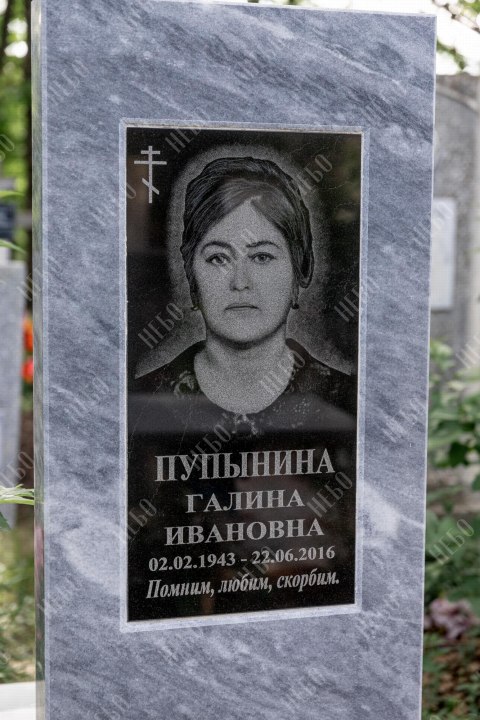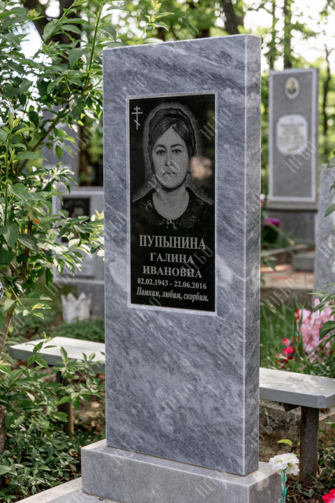 Фото на ритуальном изделии изготовлено методом гравировки алмазными иглами на черном граните. Далее фотография вставлена в памятник из выбранного материала, создавая эффект контрастности. Такой способ вставки изображения применяется в случае изготовления памятника из материалов светлых, серых, коричневых и других оттенков, гарантируя фотографии четкость и наилучшее качество, а готовому изделию долговечность. Благодаря использованию технологии гравировки на граните, фото не потускнеет со временем, не исказится и сохранит первозданный вид десятки лет.